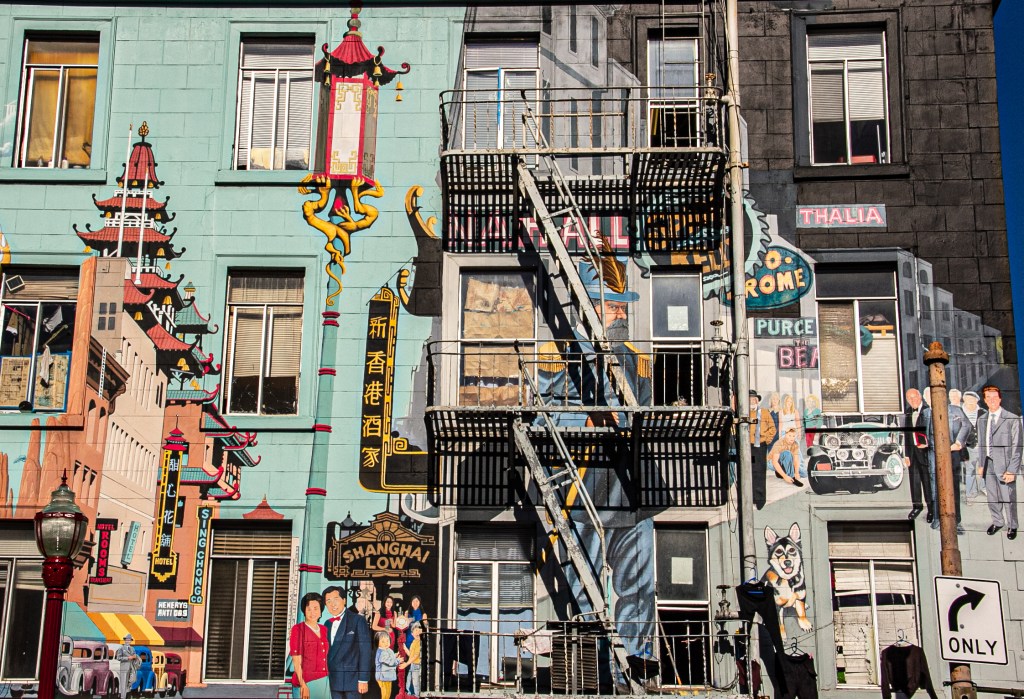 It wasn’t always this way. Broadway, a few blocks south of the park was the traditional border between Chinatown and North Beach. In the 1970’s there was a gradual, yet marked, movement of Chinese residents and businesses to the north side of Broadway, creating tension between the two communities. From an outsider’s point of view that tension seems to have been relieved. At the corner of Broadway and Columbus above the New Sun Hong Kong Restaurant is a mural painted by Bill Weber that represents the melding of North Beach and Chinatown. On the Columbus side is a mural that celebrates the jazz heritage of the city and features Benny Goodman on his clarinet, Gene Krupa on drums and Teddy Wilson on piano. The Broadway side of the building which faces Chinatown is a celebration of San Francisco’s Chinese culture.