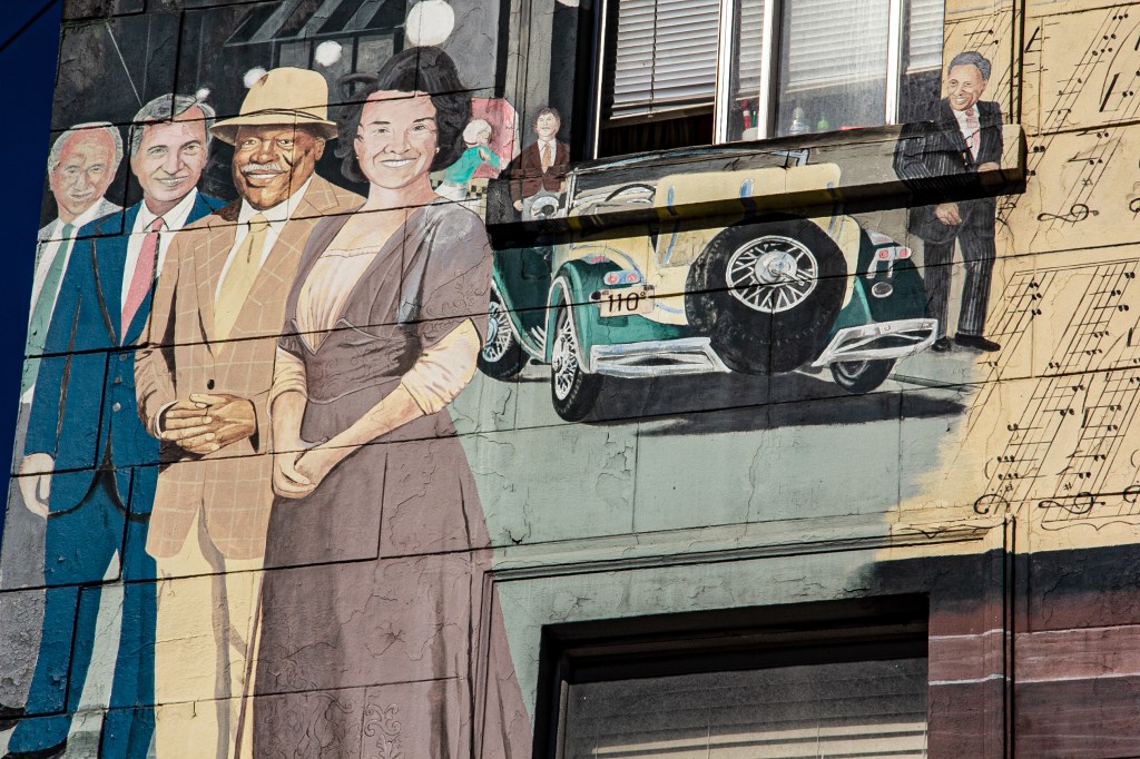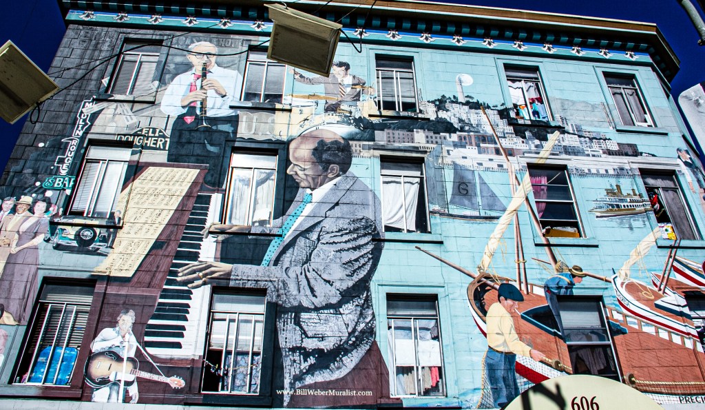 In talking about the mural Weber tells the story of a day in 1976 when he was painting a mural at Fisherman’s Wharf. A boy named Giovanni Toracca, selling cherry bombs at the tender at of 11 approached Weber and said, ‘When I grow up, I’m going to buy buildings and have you paint them,’” Years later Toracca approached Weber and commissioned him to paint the Jazz Mural on the building that Toracca had acquired at the corner of Broadway and Columbus that houses the New Hong Kong Sun Restaurant.
