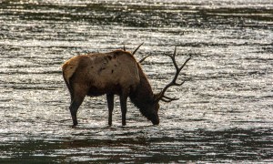Bull elk drinks from the cool Gardiner River. Yellowstone NP