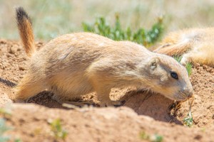 Above ground, the prairie dogs can be seen scurrying from mound to mound, stopping occasionally to feed on grasses.