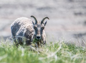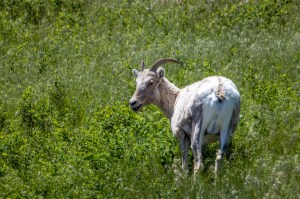 Meanwhile further along the same knoll a group of bighorns is grazing on the green grass, oblivious to me clicking away. I’d like to get closer and get their attention so they’ll look my way but not one of those who tempt fate by testing the patience of wild animals.