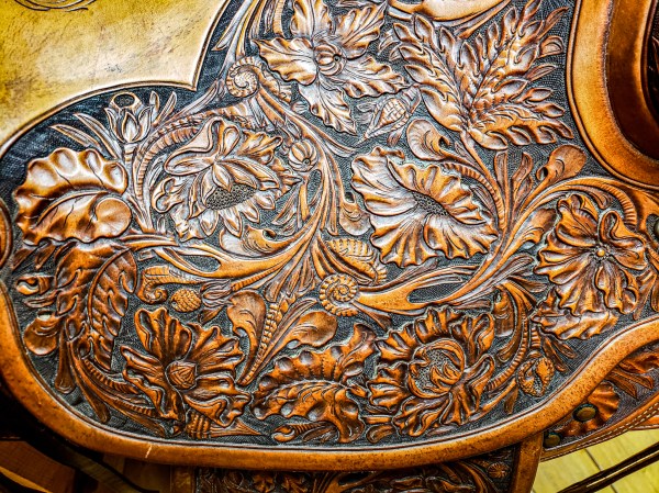 Following the advice of the rock shop guy I go out the back door, across the alley and into the next building. Off to the left are rows and rows of completed saddles. Lift up a price tag, $4,500 dollars. Another, $5,000.