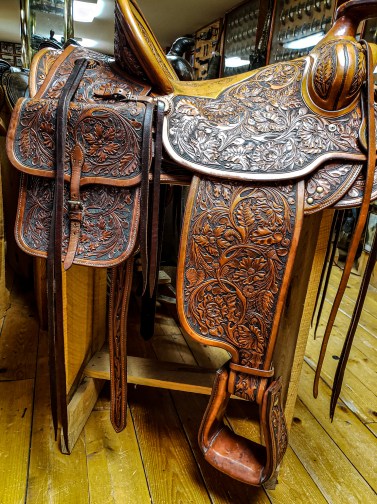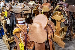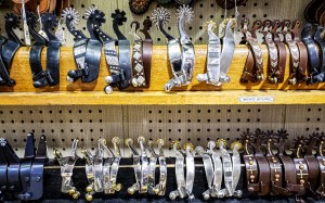 Along the walls are displays full of stirrups and spurs, blankets and a variety of gear for the rider.