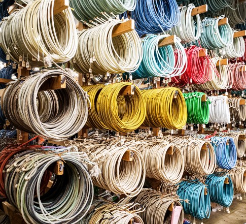 Directly in front of me, towards the back of this workshop, are towering racks filled with coiled ropes of various colors and thicknesses. I’m relatively certain that different ropes serve different purposes but I’m as ignorant about this cowboy gear as I might be in a warehouse full of aircraft parts.