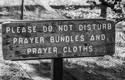 I take a photo of the sign and then swing my camera to photograph some of the bundles hanging from a nearby branch. No. Something doesn’t feel right about photographing the prayer bundles. It seems to me to be an intrusion to photograph something so personal and spiritual. Yet, aren’t we intruding just by being here?