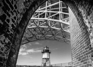 Curves and arches are everywhere at the Golden Gate Bridge. Below, the curving undercarriage of the bridge is visible through the arc of a gun port at old Fort Point beneath the bridge.