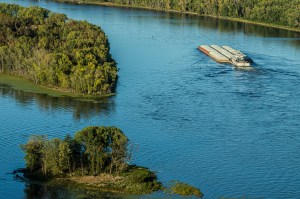 A towboat pushes a barge up the Mississippi at Lansing, Iowa.