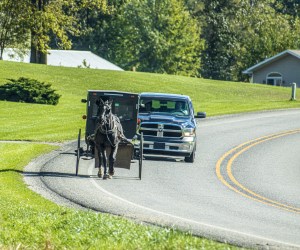 At this curve in the road in Shipshewana, Indiana, the old (an Amish carriage) is followed by the new.
