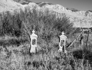 The Inyo Range looms over the two most prominent grave markers in the cemetery
