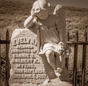 The town is named for W.S. Bodey, who had sailed around the horn from New York. Bodey was one of the four original miners. During an attempt to get supplies from the nearest town, Monoville, Bodey became lost in a winter snow storm and perished. His body was located the following spring and he was buried in an unmarked grave near the place where, alone, he froze to death. Twenty years later the residents moved Bodey’s remains to the town cemetery. The spelling discrepancy, Bodey and Bodie, is due to a misspelling by a sign painter.