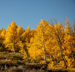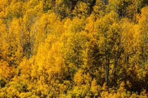 It’s an ever changing panorama. One minute we’re traveling past a dry rocky flatland, made bright with the yellow blossoms of sagebrush and the next we’re rolling past a verdant forest. Farms and ranches add some variety and every now and then we catch a glimpse of autumnal glory, where groves of aspens, gaudy in yellows and oranges, line the course of a distant waterway.