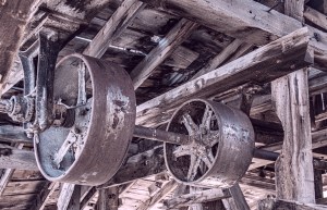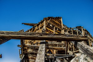 I park in an open space just down the hill from the shells of the old mine. The dominant structure at these old mining sites is the wooden headframe. Sitting over the shaft, the headframe is equipped with a rope and pulley system that allows for the raising and lowering of equipment and personnel into the mine.