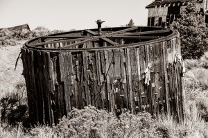 The buildings are composed mostly of wood, some of them aged to a burnished mahogany color. There are also some buildings made of tin. The rusted carcasses of two long deceased vehicles sit on the grounds. The elements and vandals have picked these bodies clean. The hulks are pitted with bullet holes.
