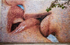 El Peto, The Kiss, is enchanting. Standing a good twenty yards from the mural I see a mosaic of tiles depicting a sensual kiss. The tiles though, are clearly not plain.