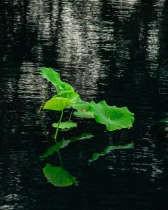 Botanical garden leaves in a lake with wavy reflections are captivating. There is a message of serenity!