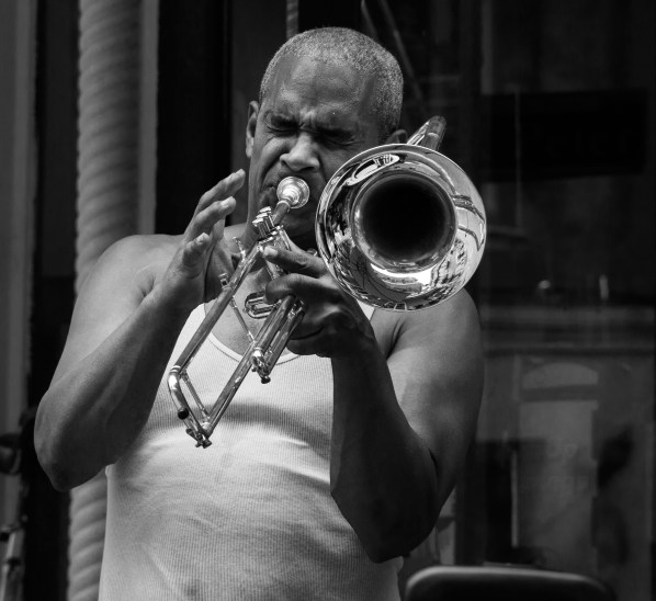 This trombone player was accompanying singer/clarinetist, Doreen Kitchens at the corner of Royal and Bourbon Streets. When he wasn’t actively playing he was either huffing on a cigarette or a pulling from a beer bottle.