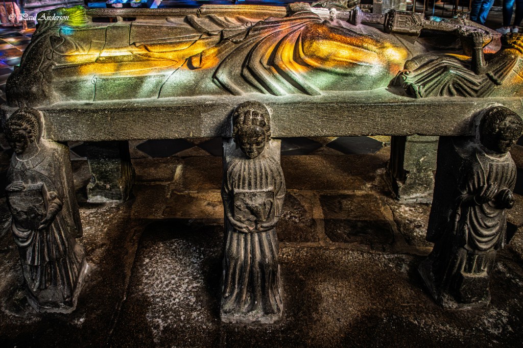 Inside the old church, the tomb of Saint Ronan was painted by sunlight colored by the stained glass windows.