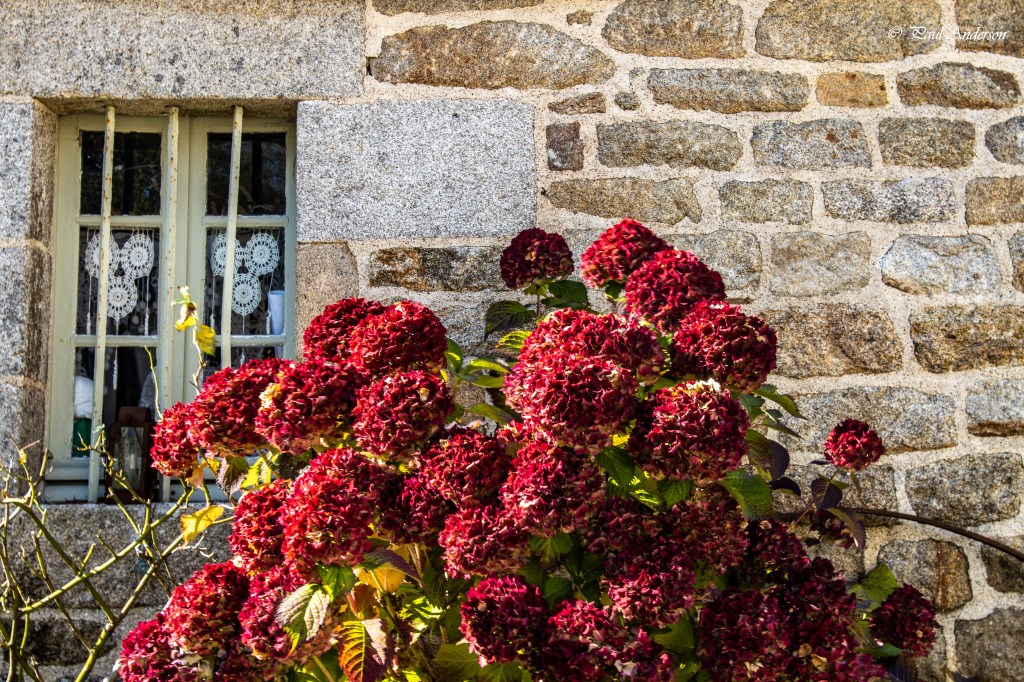 Throughout Brittany we saw flame red hydrangea. This plant was growing outside of an old stone house in Locronan.