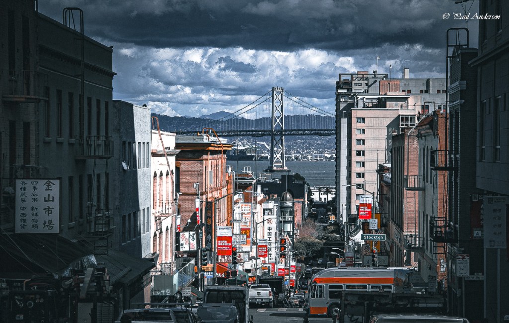 From Powell Street one can capture a classic view down Washington Street to the San Francisco Bay.