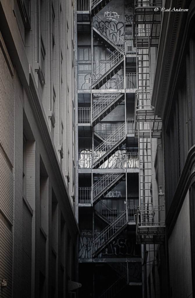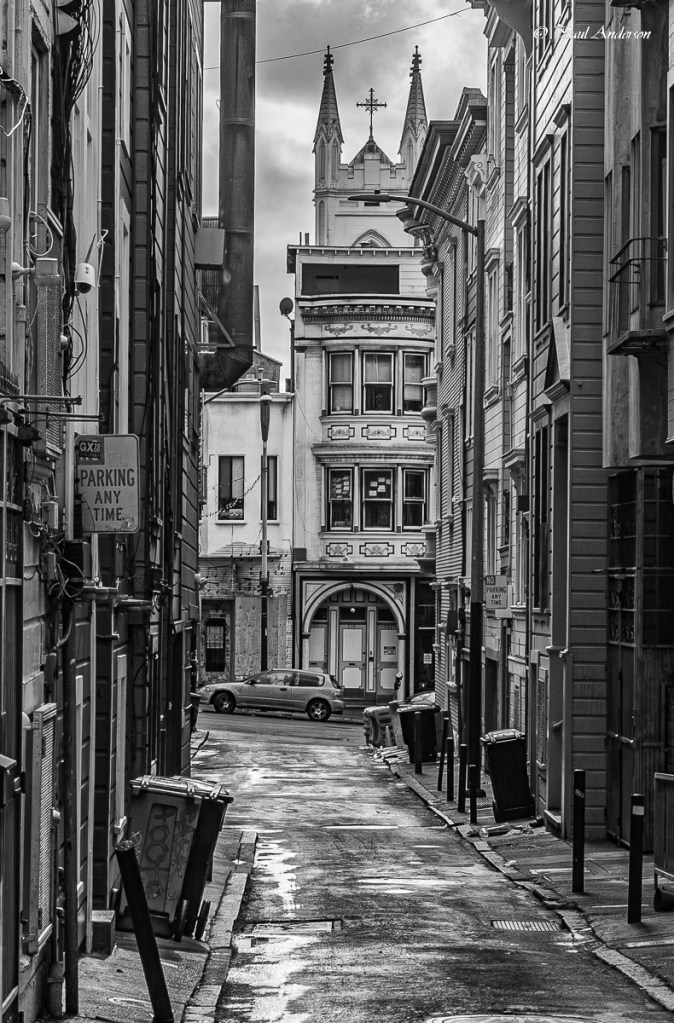 Maybe my attraction to noir fiction, the dark, brooding crime stories starring anti-hero, hard boiled gumshoe detectives, is also nostalgia based. And so I guess it’s only natural that I gravitate to shooting photos in alleys and darkening the mood of the images. The image below was taken in an alley near San Francisco’s Financial District.