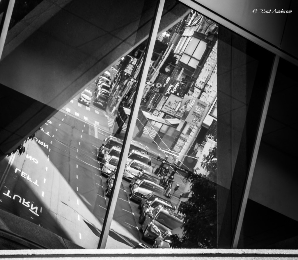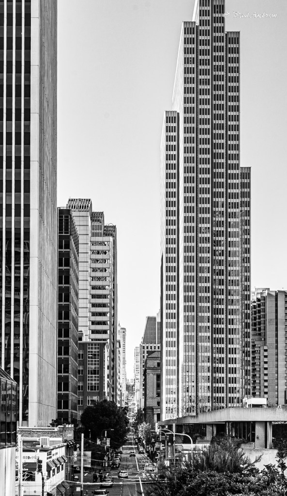 Maybe Monsieur Burri has a point. I originally shot the image below from Embarcadero Center, looking up Pine Street. In color. I sort of despised it and so it languished in the archives for ages until I started dabbling in monochrome. On a whim I edited the image into monochrome and the first thought that came to mind is that it reminded me of something that I might have seen in an ad in the San Francisco Chronicle, circa 1959. I don’t love it, but I do like the nostalgic newsy feel about it.