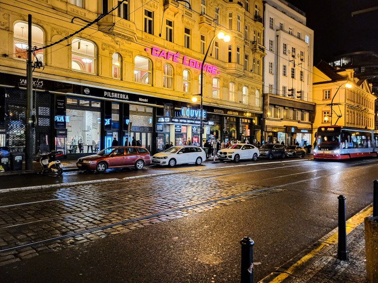Cora and I step outside into a crisp night where a crowd, mostly young, and mostly smoking, is milling around on the sidewalk on Národní, a major street, busy with cars, buses and trams. This is a different world from Stare Mesto, the old town. where our hotel is located. Národní is asphalt and modern. It reminds me somewhat of San Francisco’s Market Street, but only in a physical sense. Both are wide boulevards with buses and trams, and both are well lit. That’s about where the similarities end.